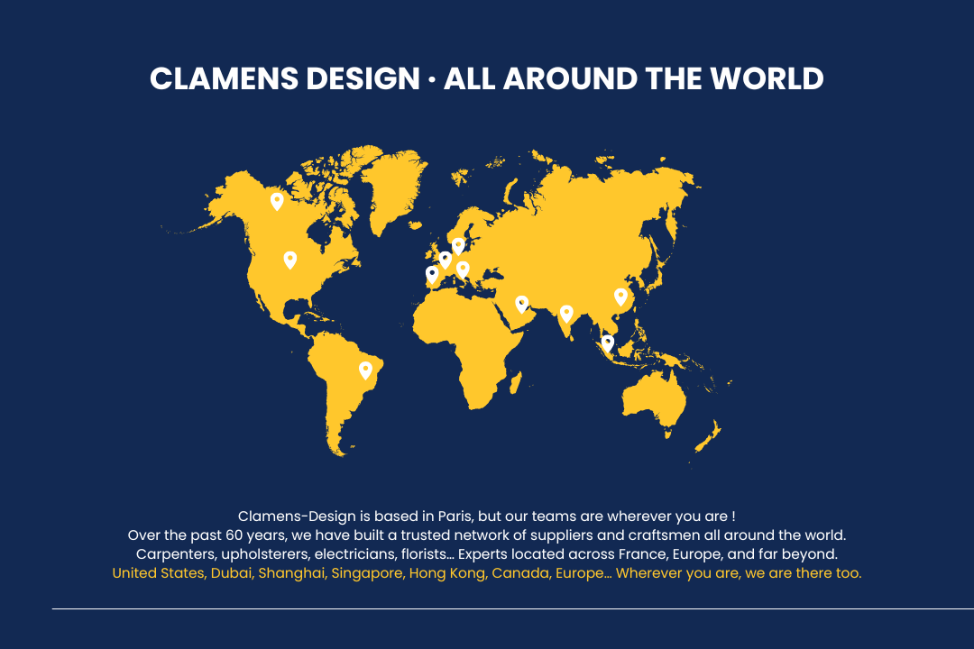 Clamens Design a également établi un réseau de partenaires fiables et fidèles, nous permettant de vous accompagner partout dans le monde pour vos projets d'expositions..